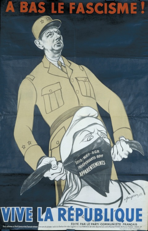 L’une des affiches du Parti communiste les plus frappantes est sans doute celle où l’on voit De Gaulle bâillonner la République avec le slogan “À bas le fascisme”. Quelle en est l’histoire ?