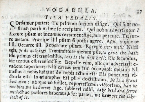 Page du Vocabula de Wedderburn consacré à la Pila pedalis, dans l’édition d’Edinburgh, 1685 (source: https://universityofglasgowlibrary.wordpress.com/2013/04/05/more-than-a-game-how-scotland-shaped-world-football/).