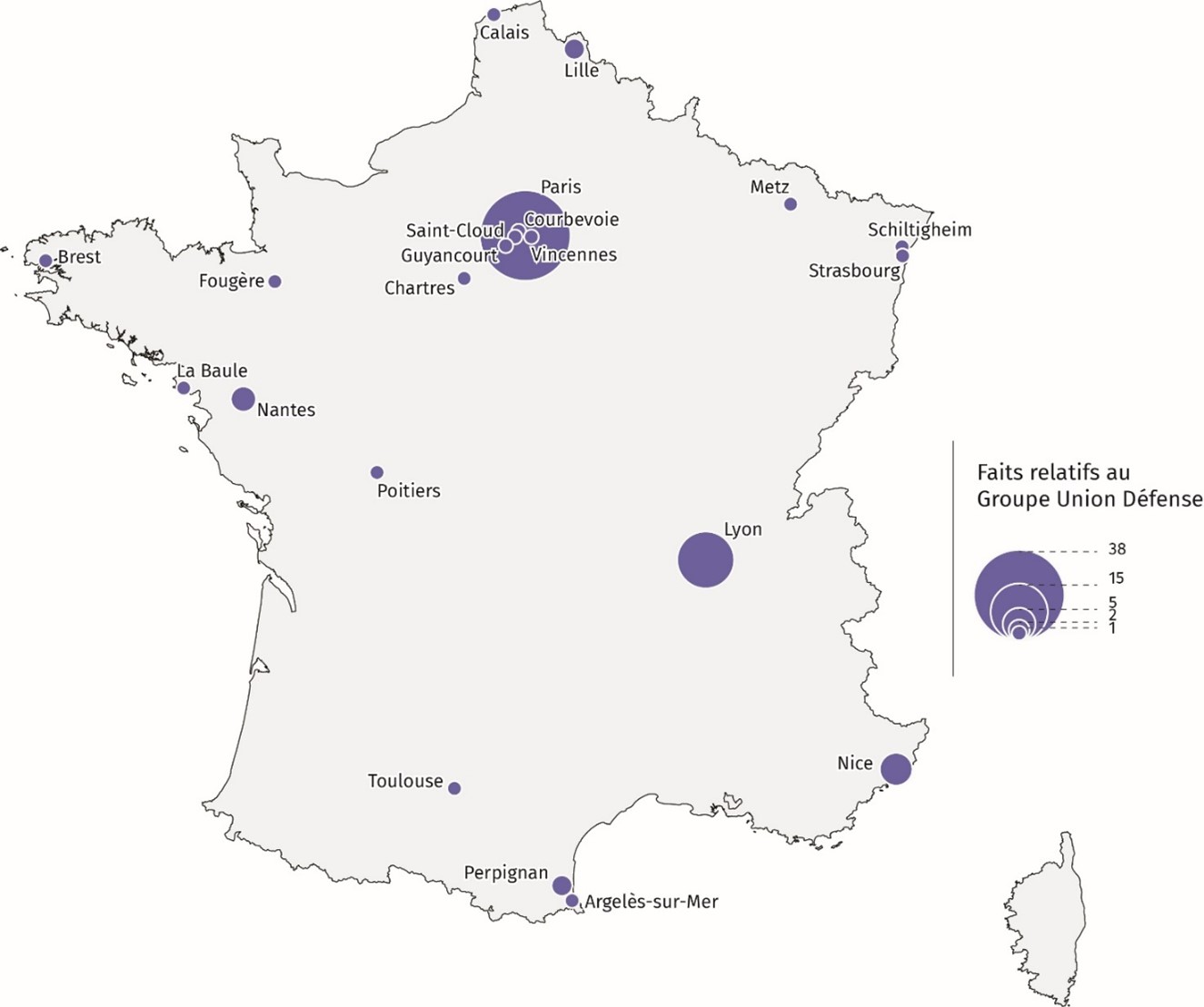 Le GUD-Lyon devient l’incarnation du mouvement. La ligne est tranchée, le groupe participant ainsi à la conférence « Paneuropa » du Réseau Reconquista à Kiev en avril 2017, à l’esthétique franchement nazifiante[62]. Le groupe s’est ensuite auto-dissous dans le cadre du lancement d’un mouvement nationaliste-révolutionnaire inspiré du CasaPound italien, le Bastion social (BS). Dans les articles de presse, les actions violentes du GUD en divers points de l’hexagone ont pu donner l’impression que ce dernier s’était extrait de son ancrage parisien, ce que paraît confirmer la transformation en BS. Cette question peut être située dans un temps plus long de l’activisme gudard par la géolocalisation des lieux de ses violences entre 1986 et 2017[63]: