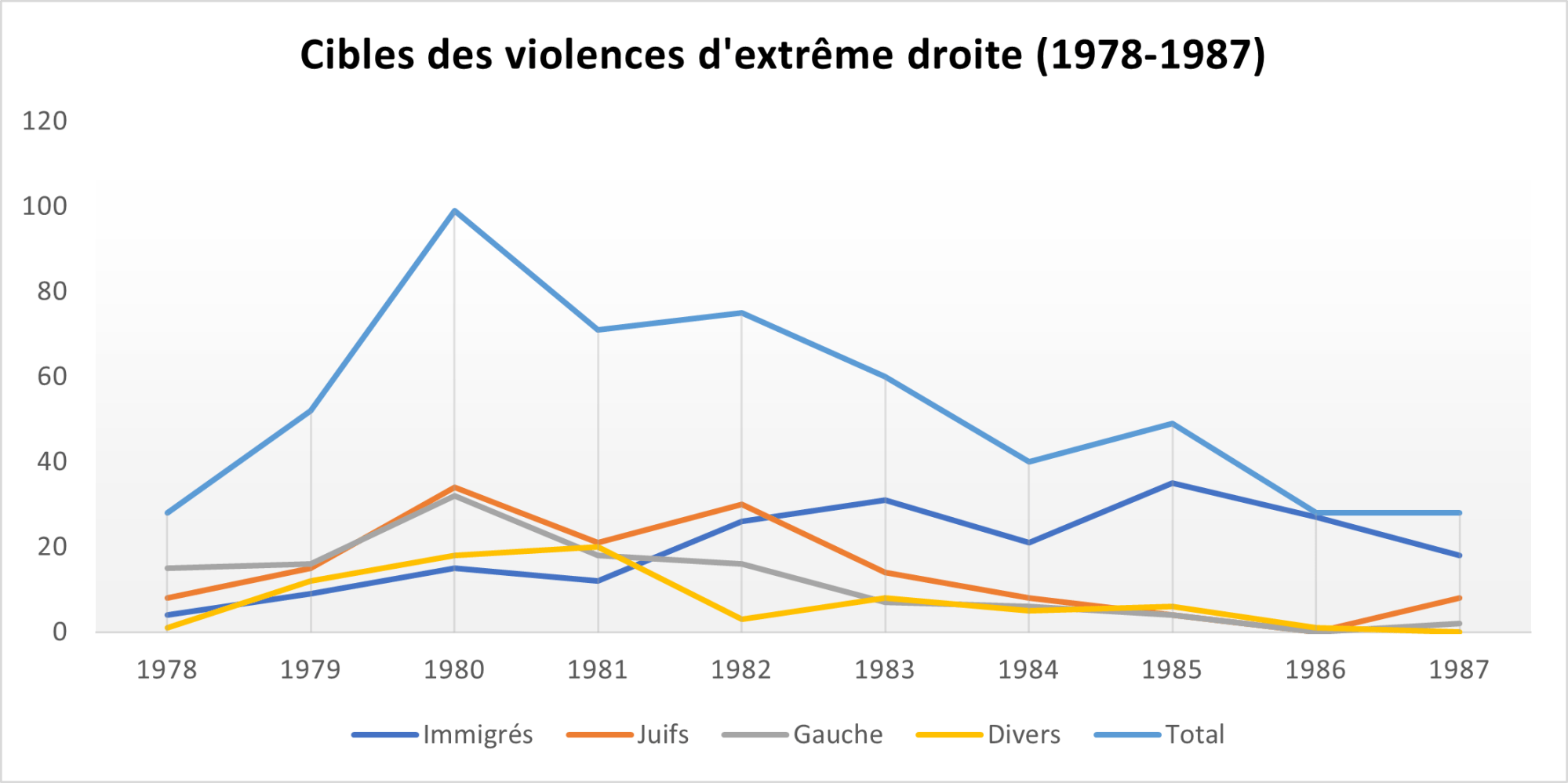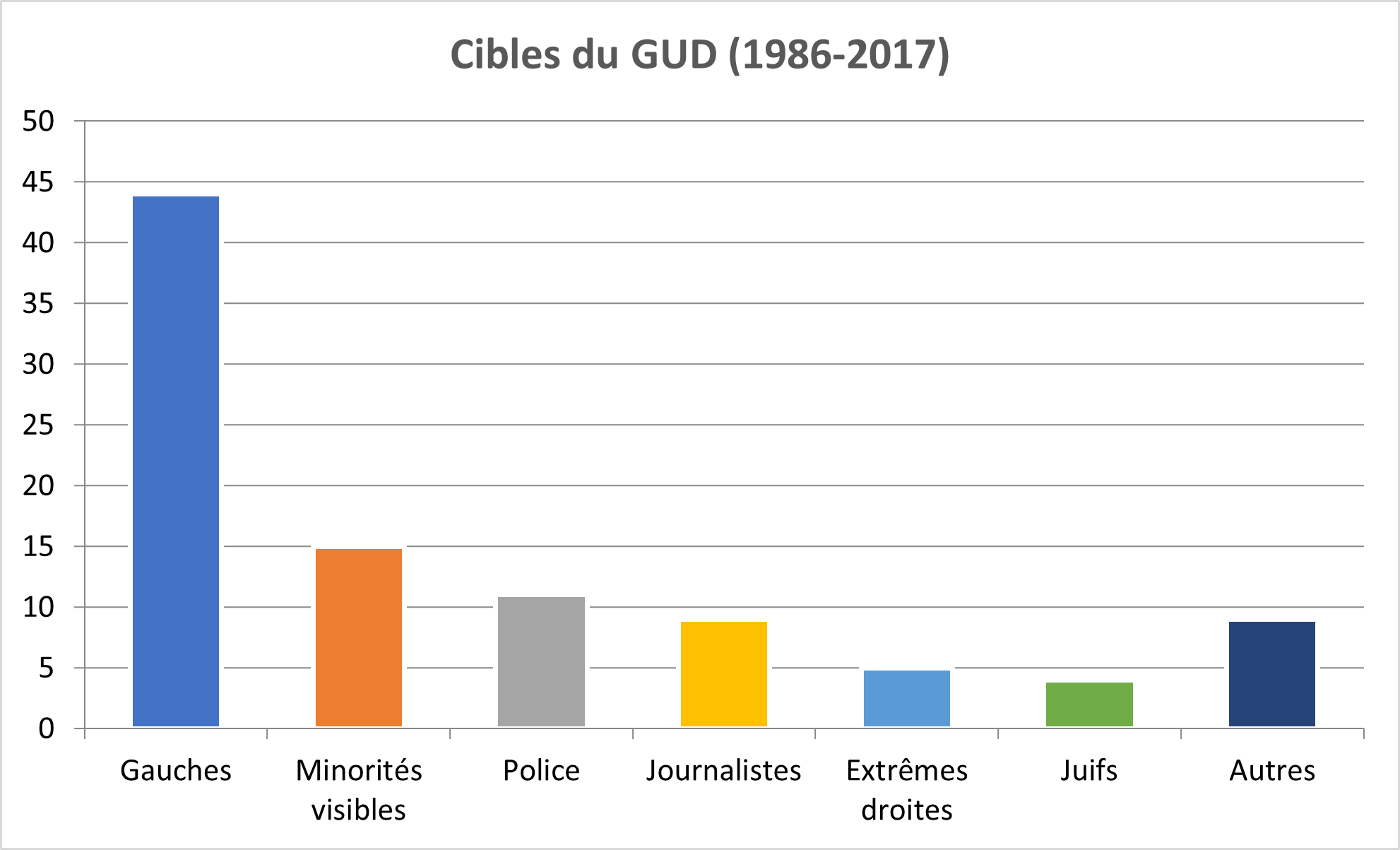 Cependant, malgré cette temporalité, le GUD ne se réduit pas au phénomène anti-gauches. La pratique d’une conflictualité multi-directionnelle est clairement une novation enclenchée dans les années 1980, avec, pour le GUD, une progression des violences racistes au détriment des actions anti-gauches. Si on classe ainsi les actions susdites du GUD de la phase 1986-2017 selon leurs cibles :