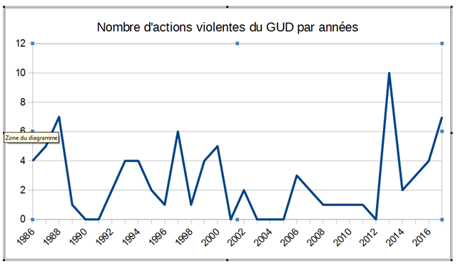 Esthétiquement, perdure une façon décomplexée de se flatter de sa violence anti-gauches, y compris quand elle est factuellement à faible niveau. À la fin des années 1990, le journal du GUD peut ainsi afficher un visuel de couverture où un rat noir écrase le crâne d’un gauchiste sous le titre « Vigiles, ambulanciers, juges, brancardiers, RG, SAMU, CRS… les emplois nous les créons ! »[31]. Pour la communication du GUD sa violence est anti-bourgeoise, voire révolutionnaire éthiquement. Ce point peut être confronté à une démarche quantitative. Dans le cadre du programme « Violences et radicalités militantes » (VIORAMIL) de l’Agence nationale de la recherche ont été recensés 82 actes de violence du GUD entre 1986 et 2017, sur la base d’articles de presse et d’archives de police. Ils ne représentent bien sûr pas un corpus exhaustif mais constituent une sorte de carottage au sein de la violence militante gudarde, retranscrits dans le graphique ci-dessous.