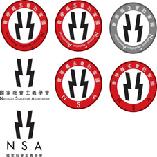 Le premier groupe « nazifiant » se nomme 國家社會主義學會 (guojia shehui zhuyi xuehui), l’Association d’étude sur le national-socialisme[2] (ci-après NSA). Outre le caractère explicite du nom, le logo (image à gauche) – sous toutes les formes que l’on puisse lui connaître[3] – ne laisse pas non plus beaucoup de place à l’ambiguïté. On y retrouve sans exception deux runes sowilo mises face à face ainsi que – dans la majorité des cas – les couleurs du drapeau à croix gammée, le rouge, blanc et noir (image à droite).