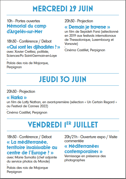 SOS Racisme tient un festival « Nostre Mar : Liberté, Égalité, Méditerranée » dans les Pyrénées-Orientales du 27 juin au 3 juillet 2022. Le monde méditerranéen est un espace sur lequel nous avons mis en ligne diverses publications et on croisera lors de cet évènement divers contributeurs de Fragments sur les temps présents et certains de leurs amis :