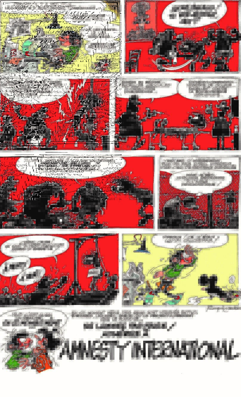 Ainsi, en 1978, la section belge d’Amnesty International commande une affiche à Franquin, qui accepte. On y voit Gaston sommeiller comme à son habitude sur son bureau et cauchemarder qu’on le torture de différentes façons (selon des pratiques alors utilisées par les dictatures ou régimes totalitaires de l’époque[58]), avant de se faire envoyer dans un camp d’internement[59]. Franquin est moins sombre pour la campagne pour Greenpeace. Un équipage de baleinier est mis en échec dans le gag où Greenpeace engage Gaston pour éloigner les baleines à l’aide de son gaffophone[60], l’idée étant que les baleines ayant l’oreille musicale selon les militants de Greenpeace, elles fuiront devant les sons de l’instrument. Ce navire baleinier se retrouve plus loin dans le même album, cette fois-ci sur deux pages[61], Gaston le bombardant, oniriquement, à l’aide de projectiles dont la charge est composée d’une super-colle. Ce militantisme en faveur des baleines reflète l’opinion de Franquin, qui trouvait les baleines magnifiques et ne supportait pas qu’on les massacre. Greenpeace utilise Gaston pour mettre en lumière ses propres actions de sauvegarde. Il est d’ailleurs particulièrement intéressant de noter que Franquin mentionne explicitement Greenpeace, là où d’autres auraient choisi une association fictive.
