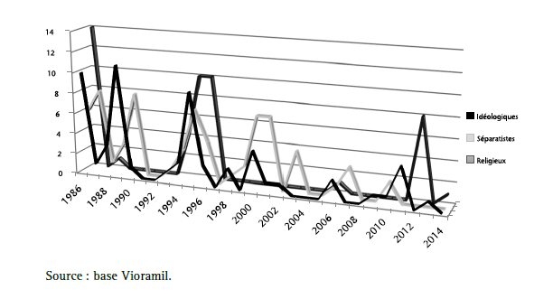 Ainsi, la distribution des violences meurtrières laisse apparaître un tableau très inégal qui implique principalement trois familles pour des faits distincts : la moitié de morts violentes (sauf djihadistes) concerne les militants politiques, la moitié des assassinats (sauf djihadistes) implique des mouvements séparatistes, et plus des deux tiers des victimes ont été provoqués par des violences à référentiel islamique.